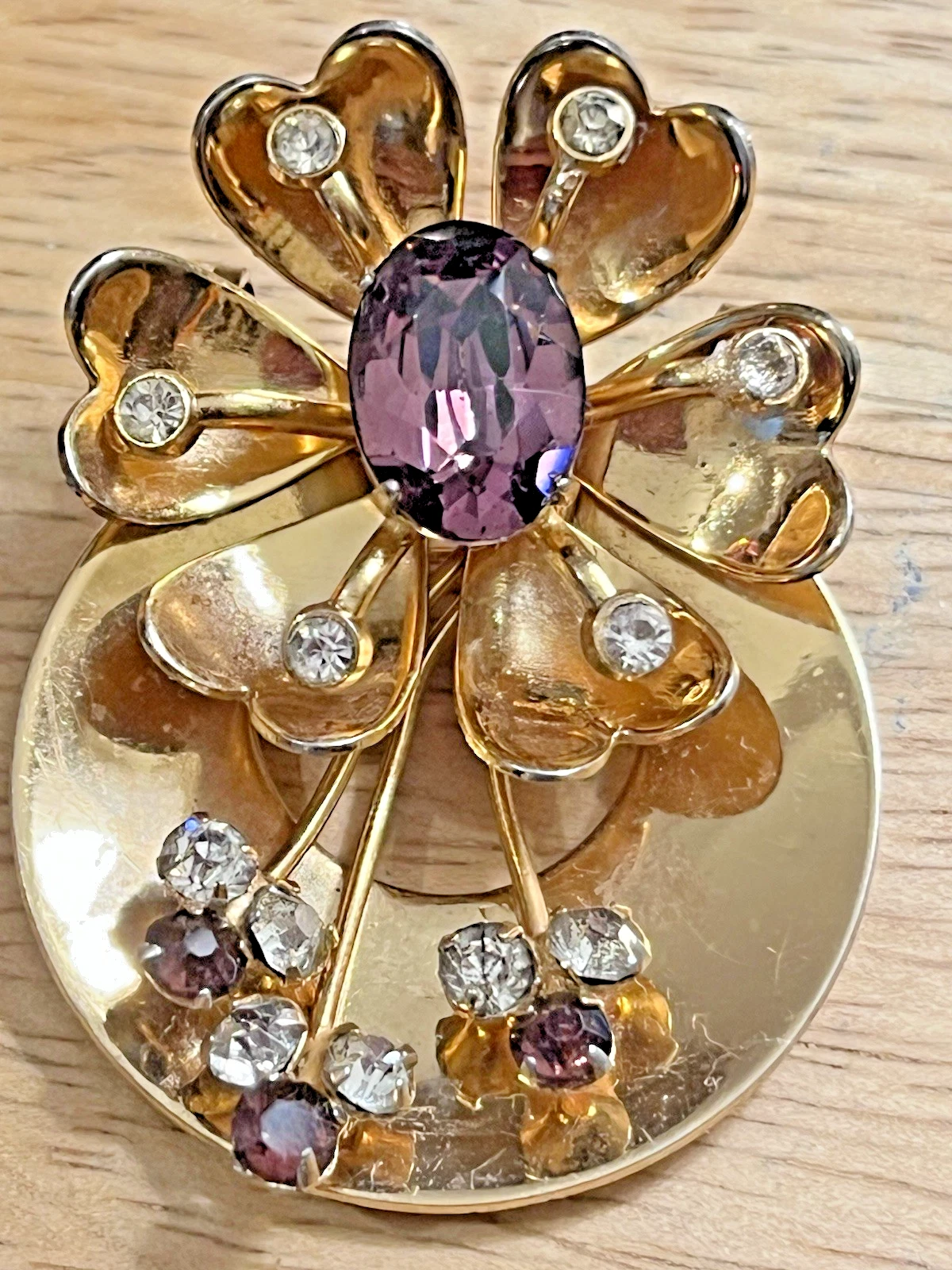 This signed Coro brooch from the 1940s Retro era is exactly that for us. We’ve had it in the vault for a while, but pulling it out today felt like seeing it for the first time. The way the deep Amethyst purple glass center plays against the gold-tone hearts is nothing short of regal.
